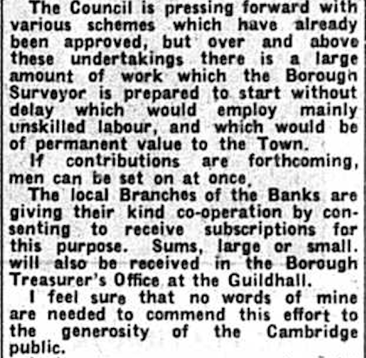 In Florence Ada Keynes’ early days, the standard response to a crisis of unemployment and poverty was to raise money for a fund to alleviate poverty. You might be lucky to live in a parish that gave you a few bags of coal and some rolls for Christmas in Victorian Cambridge. Mayor Mrs Keynes founded the Cambridge Unemployment Fund knowing that the Conservative-led council was unwilling to vote for an increase in ‘the rates’ (what pre-dated today’s council tax) – something covered in the same newspapers of the day.