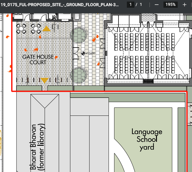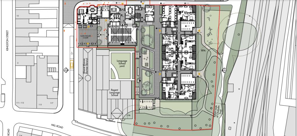 Above – same diagram as before, just zoomed in more. You can see the old Mill Road Library at the bottom left, and the proposed community hall in the top right.