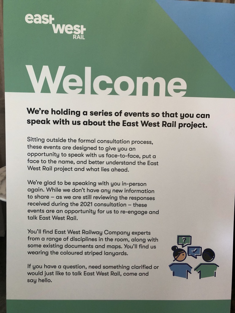 As BBC Look East said on telly just now, there wasn’t much ‘new’ information announced at the event. What was on the boards and in the handouts can be found on their website https://communityhub.eastwestrail.co.uk/. This was as much of an opportunity to get the first feel for what the public thinks beyond online exchanges. I got the sense the staff appreciated being out and about.