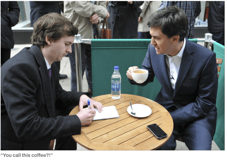 Above – From The Tab Cambridge, journalist Chris Havergal taking shorthand notes during an interview with Ed Miliband MP in Market Square in April 2013.