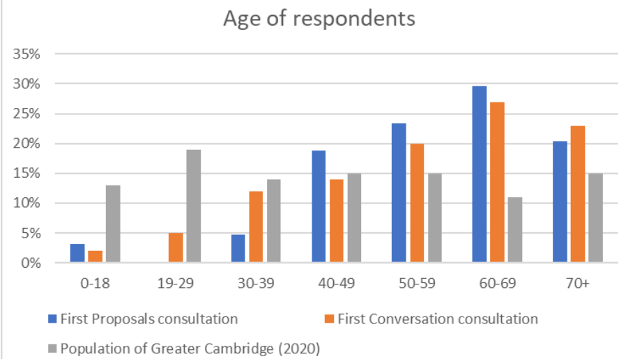 Above – from Item 7 Appendix 1 – the age distribution of those responding to the Greater Cambridge Emerging Local Plan 2030-41. The over-50s are over-represented, and the under-30s are under-represented. And it’s not like they haven’t known about this issue. It took Puffles’s 2014 manifesto (see Theme 2 – supporting young people) to raise the issue at the ballot box.