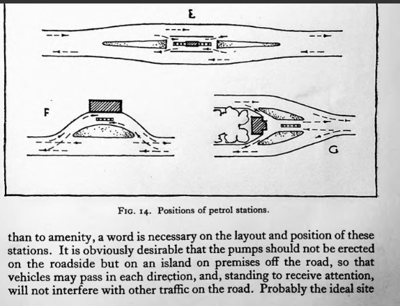 Finally, there is the careers pitch – and not just to young people. What opportunities are there for people to change career and retrain in the modern infrastructure sector? Especially given the huge work needed to transform our economy and society into a zero carbon one. It’s easy to forget how much effort went into building up the fossil fuel economy, from the oil wells, refineries, pipe lines, petrol stations, oil tankers, vehicle manufacturers, the networks of garages and the system of taxation and road maintenance. Town planning pioneer Thomas Sharp gives us a glimpse of his early guidance on petrol stations and road layouts in his book Town and Countryside from 1931, which I’ve digitised here.