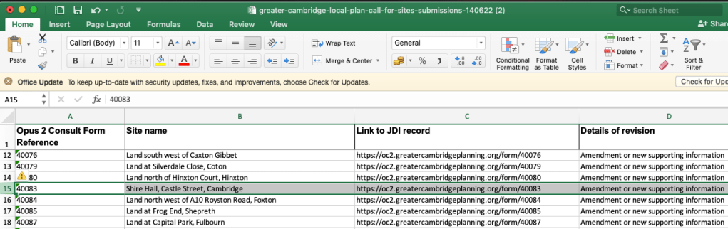 Above – you see the tab that says “Supporting Evidence” in black rather than dark pink? That’s the one you want to click on. That will display the hidden supporting documents – where the interesting things are. In this case, I’m looking at the submissions by a well-known property firm acting for a very well-known Cambridge College and land owner.