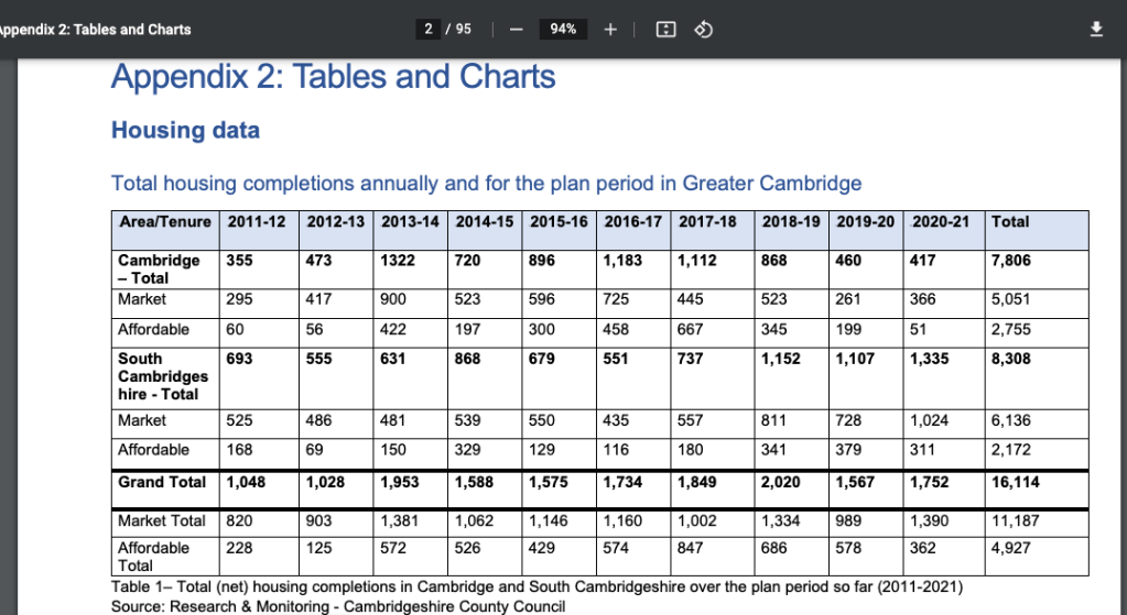“Between 2011 and 2021 (the first ten years of the plan period for both adopted Local Plans), 16,114 net additional dwellings were completed (7,806 dwellings in Cambridge and 8,308 dwellings in South Cambridgeshire)”