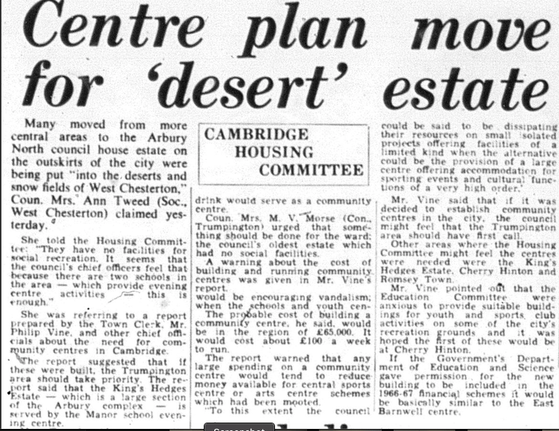 “They have no facilities for social recreation. It seems that the council’s chief officers feel that because there are two schools in the area – which provide evening centre activities – this is enough”