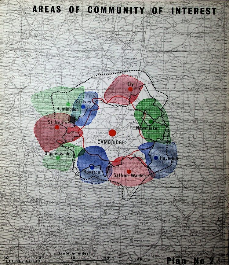 Above – from Lichfield 1966, the dotted line of towns that had Cambridge as their main regional economic and retail centre, but acted as their own local centre and for nearby villages (shaded in blue, green, and red.)