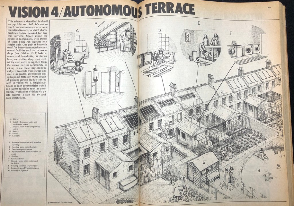 Once this is over, the public authorities, the private utilities, large institutions and firms that offer installation services all need to get together and work out how best to put policy and delivery rocket-boosters on retrofitting our city and county. It’s not like people haven’t been thinking and experimenting over the decades about this either. In the pioneering tome Radical Technology from 1976 – digitised here, they show an example of a retro-fitted communal living street of Victorian terraces that include solar water heaters and rainwater collection systems.