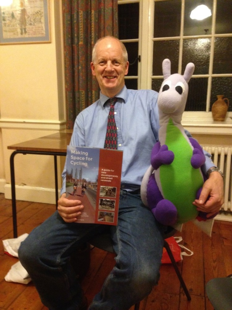 Above – Cllr Lewis Herbert with Puffles at the Cambridge Cycling Campaign hustings 2014 at the Friends Meeting House – the only ward candidate he’s had to face on a public platform for over a decade.
