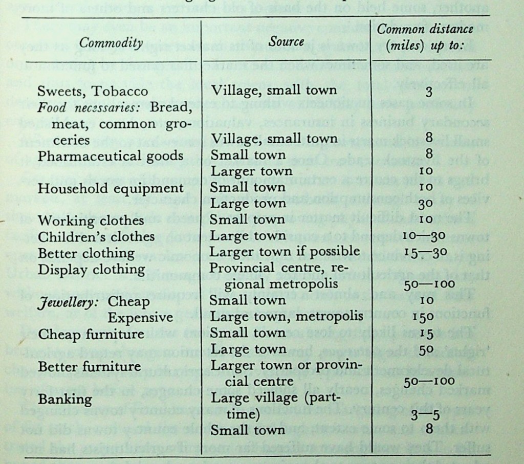 Here you go. This table shows two different systems of grading towns, and how far their service areas / influence should extend. The larger the grade number, the bigger its population and the greater its radius of influence.