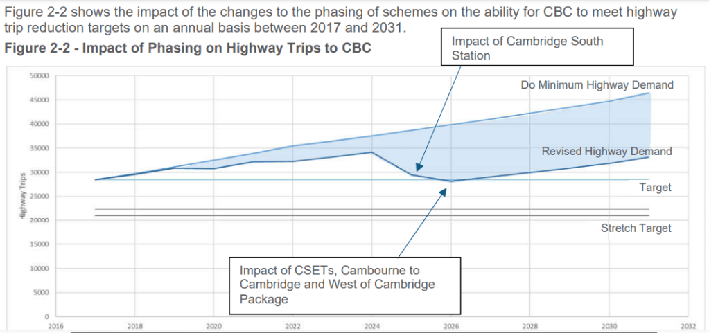 “The withdrawal of the Cambridge Autonomous Metro is predicted to lead to an additional 16,830 highway trips in 2031, compared to the predictions in the 2018 study. When compared to the target to reduce highway demand to 2017 levels by 2031 this leaves a deficit of 4,662 highway trips to reach the target.”
