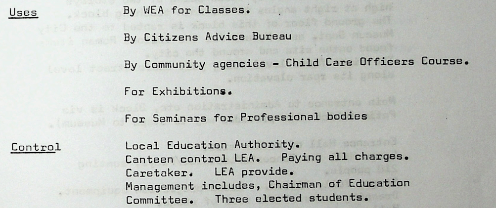 One other thing I’ve taken away is the concept of multiple organisations using and funding such a centre so that the withdrawal/demise of one does not threaten the future of the institution. At the same time, any new adult education institution has, in my opinion, to have a ‘Unique Selling Point’ of providing things that other community providers cannot provide. It cannot be established *at the expense of* courses, classes, and workshops in residential neighbourhoods. The same goes for other facilities, whether swimming pools, sports centres, or concert halls.