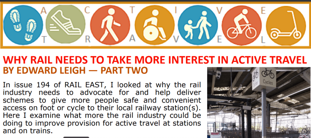 Above – from Rail Future East’s e-magazine s Sept 2022 by Edward Leigh, telling rail campaigners to take an interest in active travel campaigns.