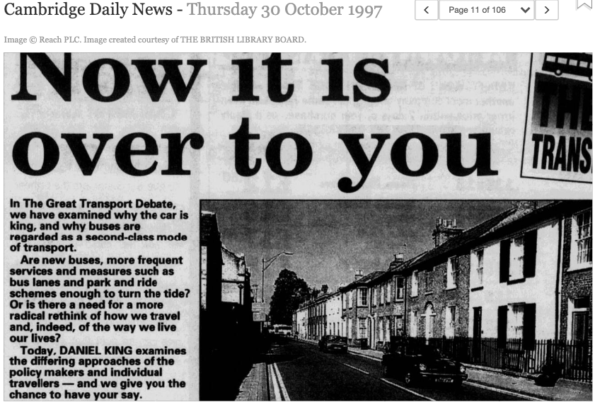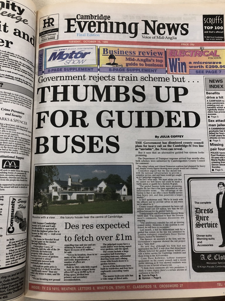 There’s a lot of history behind this controversial project. The proposals pre-date Tony Blair’s Government, as this front page from the Cambridge Evening News in 1996 from the Cambridgeshire Collection demonstrate. I had just started sixth form college and was trying to get my head around the incredibly long commutes that many of my classmates had to do to get to college every day.