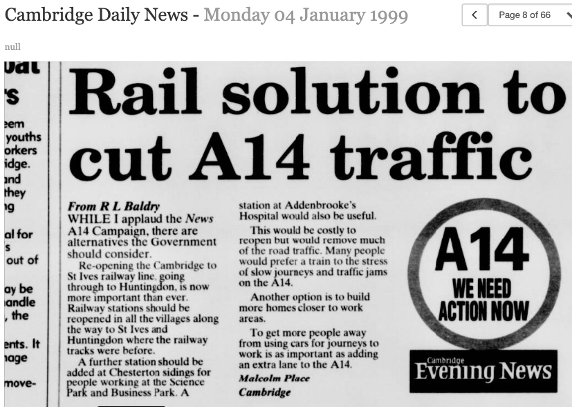 “Passenger journey levels by rail are now over 20% higher than they were when the Cambridge – St Ives railway was last operational. The population along the A14 corridor has risen dramatically during this time and adequate demand now exists to support a railway.”