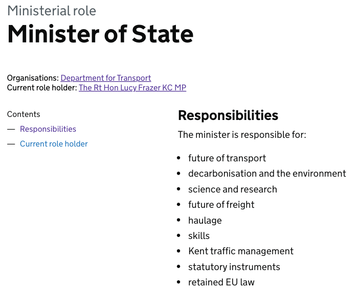 Freight aside, there isn’t a specific mode of transport that the Minister is responsible for. Normally a minister of state would have had a major executive agency reporting to them – such as Highways England [motorways and major roads], Network Rail [trains], the Civil Aviation Authority [Airports]. Given her legal background, I can understand why the legislative issues have been allocated to her, but it will be interesting to see how she works with other ministers who are responsible for transport as is, rather than transport as it might be. It also means she does not have to deal with Stagecoach as a minister (although she has spoken out as a local MP) – that policy area stays with Baroness Vere, who has at one end of the spectrum local transport, walking and cycling, and at the other end of the spectrum, space travel.