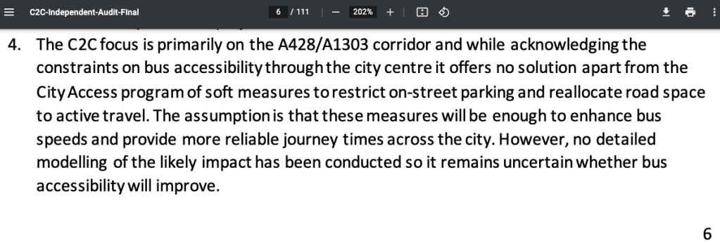 The Independent Audit was a substantial document – you can read the papers here. Within it, there was this little comment that warned about the Cambourne-2-Cambridge Busway that has generated huge opposition ever since it was first proposed.