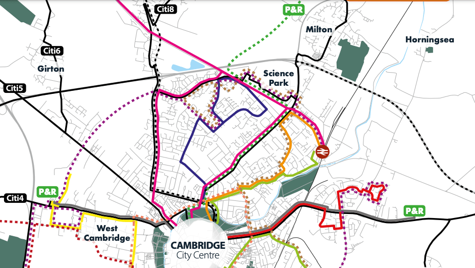 You can see the proposed outer ring on the left – the purple dotted line. Effectively it’s an Addenbrooke’s – Eddington – Science Park – Station service.