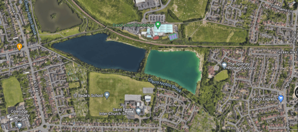 Above – the East Cambridge Lakes on G-Maps with the David Lloyd Centre above it – and the Tins Bridge just to the left of the “D” for David.