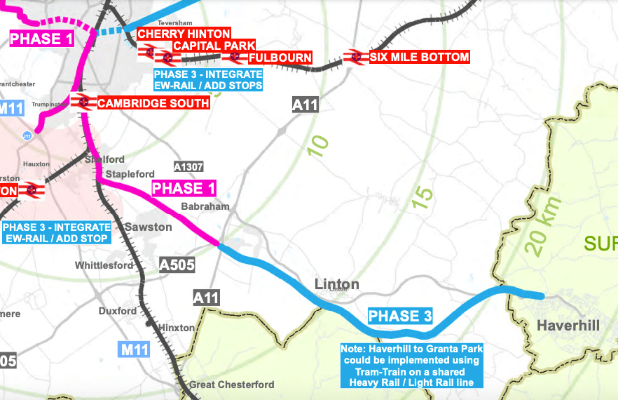 Above – An earlier iteration exploring how to use light rail on the old Cambridge-Mildenhall line to link up more of the East Cambridgeshire villages, including the new housing estates at Marleigh and the proposed one at the Cambridge Airport site, the Newmarket Racecourse, Wicken Fen nature reserve and onto Soham & Ely using a light rail.