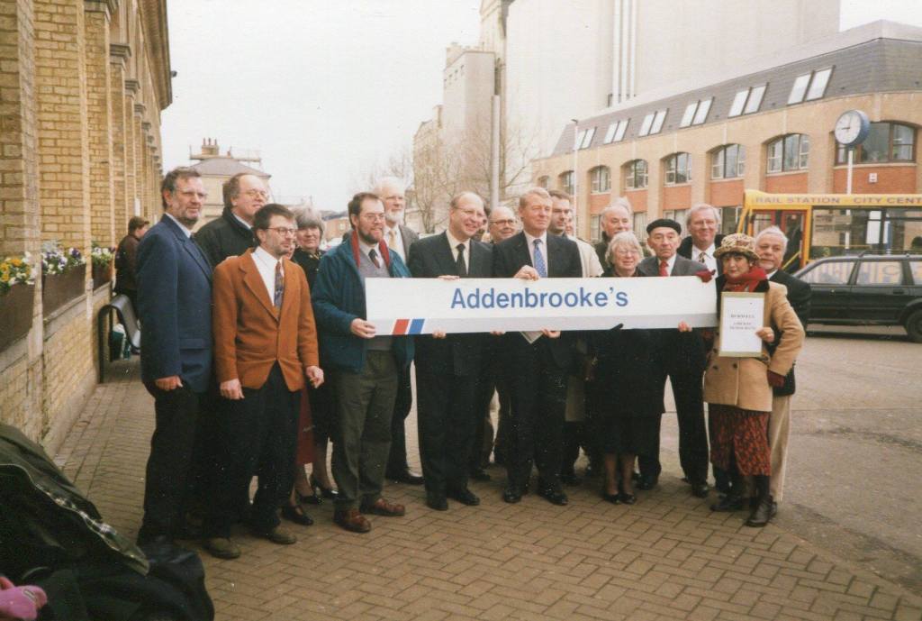 Above – from the late 1980s, the late Paddy Ashdown (then Leader of the Liberal Democrats) with local councillors and supporters campaigning for a new railway station to serve Addenbrooke’s Hospital. Via Aidan van de Weyer.