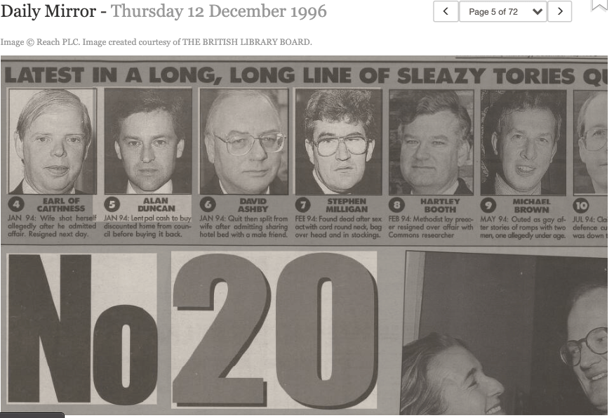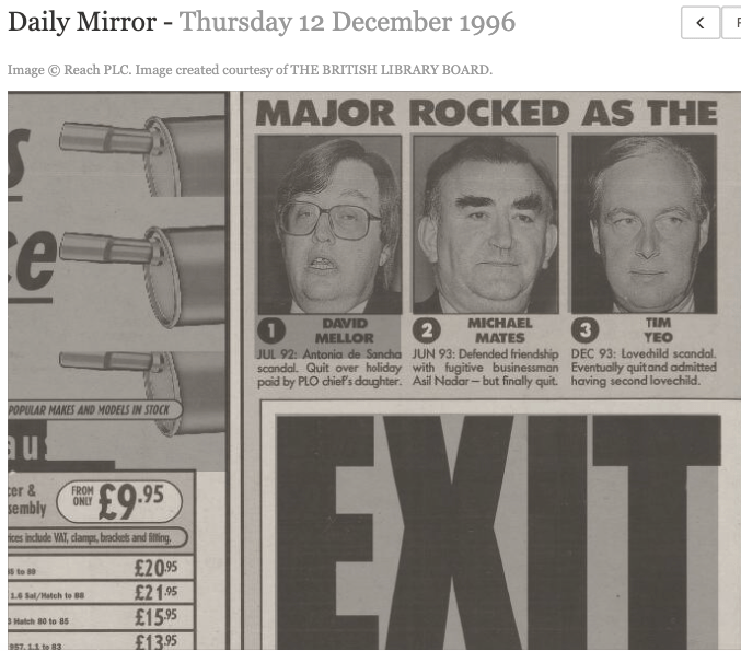Above – the Daily Mirror (from the British Newspaper Archiver here) amongst others going to town on the turbulent Tories of the mid-1990s – note the all-male line-up.