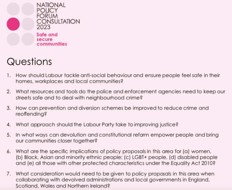 “Labour’s National Policy Forum (NPF) launched its 2023 consultation on Monday 30 January.””Labour’s National Policy Forum (NPF) launched its 2023 consultation on Monday 30 January. [It] is open to branch and constituency Labour parties; affiliates such as trade unions and socialist societies; and external stakeholders such as charities, think tanks, businesses and civil society groups.”