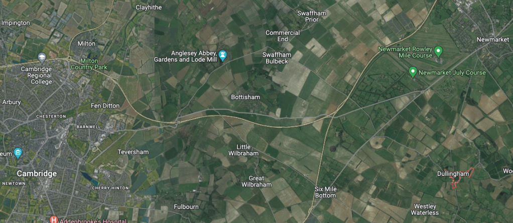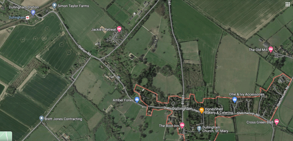 Above on G-Maps – Dullingham, south of Newmarket and east of Cambridge – with a tiny railway station up the road from it.