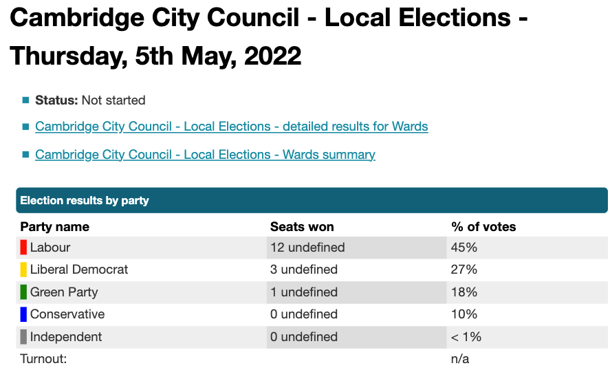 You can look at the general election history of the Cambridge Parliamentary Constituency here, noting that in 2019 the party could only find a candidate from Harlow to stand for them, and he polled the lowest percentage of the vote in the party’s history in Cambridge. But that was still over 8,000 votes. Hence my longstanding view has been that the Cambridge Conservatives have been *underperforming* at elections for decades – mainly because they haven’t had anyone doing the regular door-to-door campaigning that other parties do in their target wards. Ironically, the voting system that Conservatives nationally are so strongly in favour of (First Past The Post) is one that amplifies their defeats in Cambridge, and amplified their defeat in South Cambridgeshire as well. Make of that what you will.