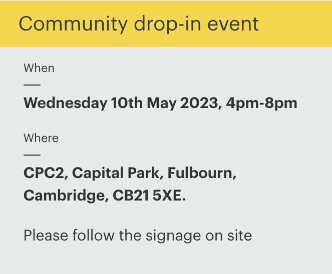 TL/DR?: Go to the event on Wed 10 May 2023 at the CPC2 building from 4pm-8pm. The Citi1 takes you there by bus from both Emmanuel Street in the city centre, stopping at Cambridge Railway Station, and Addenbrooke’s bus stop. (See also live bus times for the various stops at http://www.cambridgeshirebus.info/)