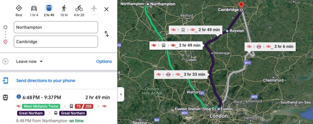 Above – from G-Maps – no direct train to Northampton from Cambridge.