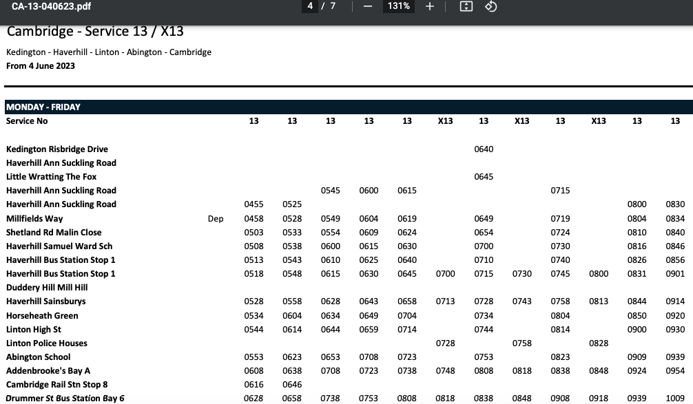 The service from 0730 gets in at 0818 to Addenbrooke’s – about 50 minutes assuming little traffic. From Haverhill Sainsbury’s to Addenbrooke’s takes 35 minutes.