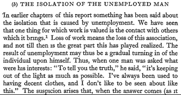 “…isolation, in prosperous places, is not only an effect, but a cause of unemployment; as though the man with no social ‘‘backing” loses heart more easily and drops out of the race sooner than the man who has the support of family life or other associations behind him.”