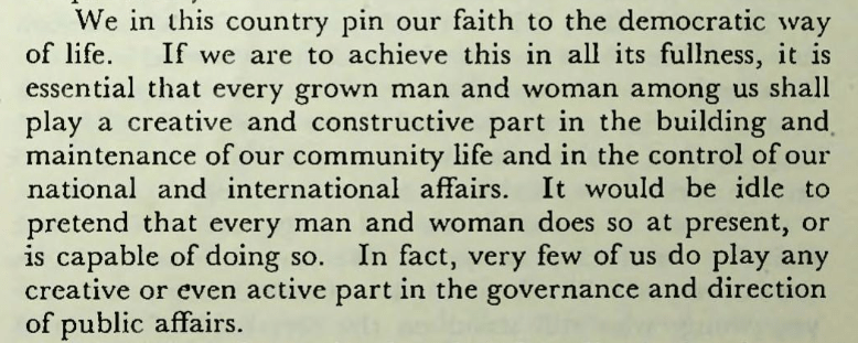Fast forward to the end of the Second World War and we have Sir Richard Livingstone (VC of Oxford 1944-47) writing the following in a foreword for a pamphlet on citizen centres adult education.