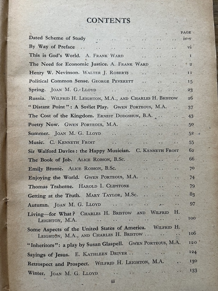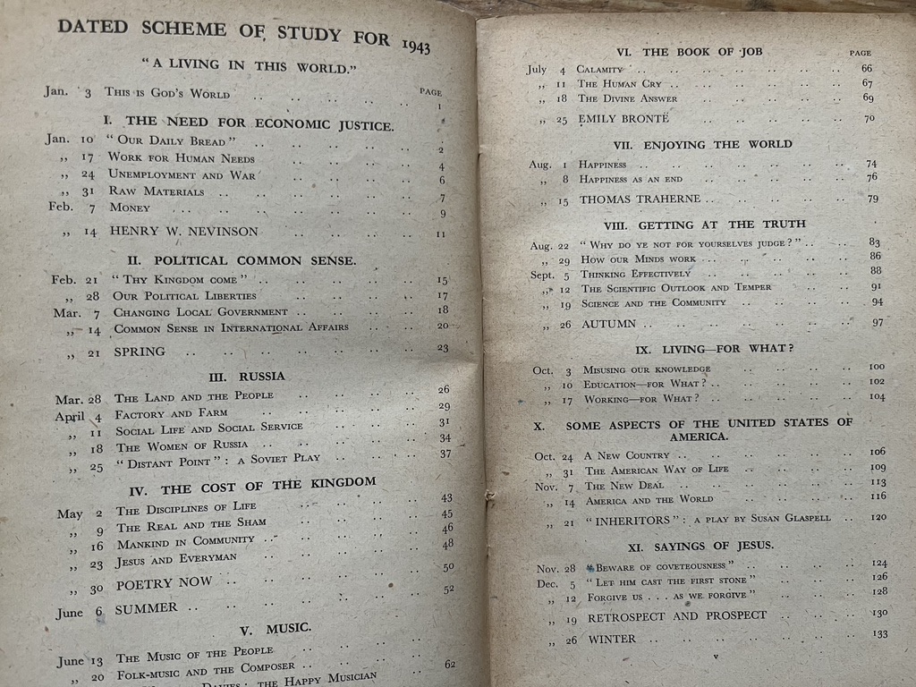 Below: A proposed schedule for learners. Note this was at a time of no television or internet. Furthermore, in the opening classes, note the religious framing of political issues.. Furthermore, note the context of thinking about life after another major war. What would you be feeling having lost friends in action, as well as having friends who had lost parents in the previous world war a generation before? What would you be feeling towards the political establishment of the day?