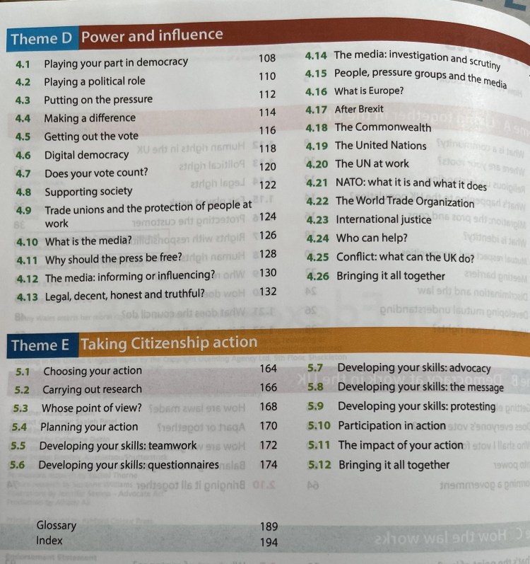 Which is all well-and-good, but does not deal with the almost complete absence of citizenship learning at school that my generation experienced throughout the 1980s & 1990s. Which is why I’ve said recently that Combined Authorities should explore offering the GCSE Citizenship Course as part of their adult education offers. Because when you look at what the teenagers of 2023 are learning, using Jenny Wales’ textbook and contents page as an example, what the teenagers cover over two years is comprehensive.
