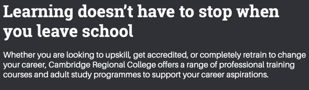 Above – CRC’s adult learner’s prospectus, p4: A message from Cambridge Regional College – one that needs reinforcing across our city