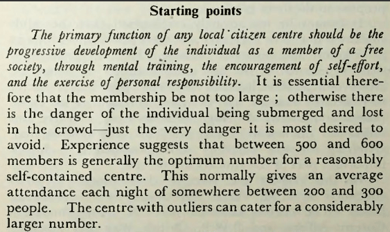 The first is this lovely pamphlet from 1944 on Citizen Centres for Adult Education, which Sir Richard Livingstone wrote the foreword for. Two paragraphs stand out for me regarding size, and culture. On size first:
