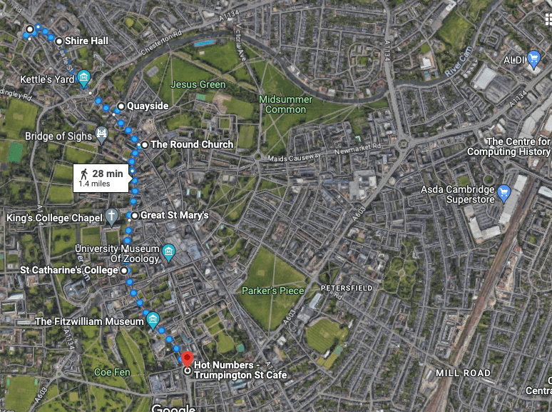 Above – a walking route from Castle Hill to The Fitzwilliam Museum and Hot Numbers Coffee