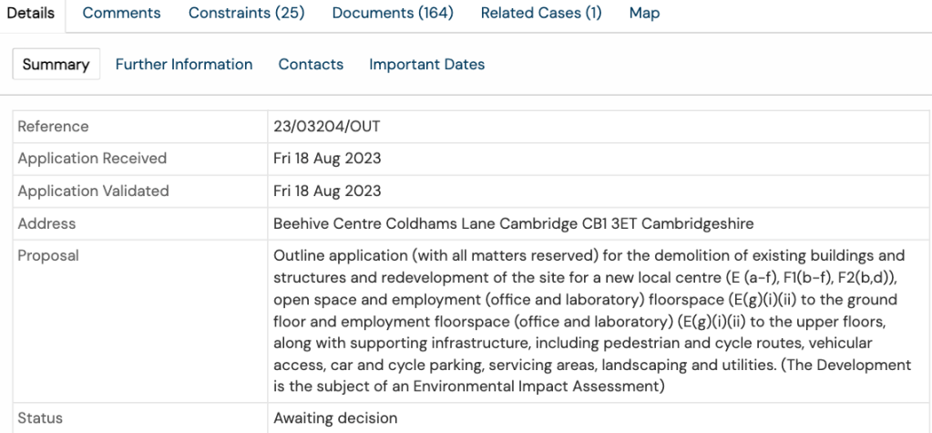 To get to the planning portal, see https://applications.greatercambridgeplanning.org/online-applications/ and type in the reference 23/03204/OUT into the simple search box. You’ll be presented with something that looks like this: