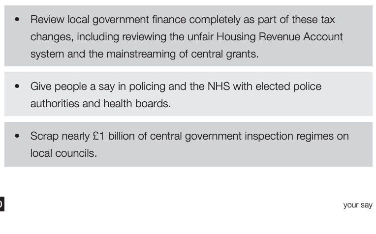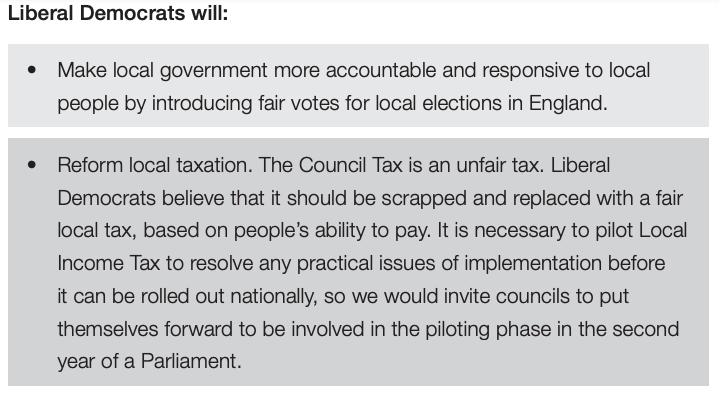The Liberal Democrats want to change how local government is financed and also want to change how local councils are elected – i.e. getting rid of First Past The Post. Note their proposed local income tax pilots. There is a substantial amount of historical research on local income taxation going back decades including: