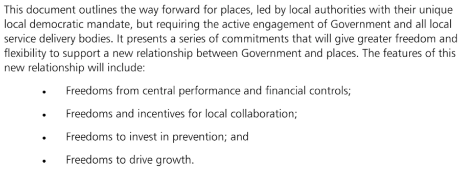 When Eric Pickles and George Osborne hit the public sector with their big axe (taking my civil service career with it!) the benefit to local areas was meant to be getting rid of all of the performance management frameworks that the previous Labour Government had put in place. One of the things that had irritated Conservative-run councils for over a decade was what they saw as central government intervening in things that they thought should be the responsibility of local government alone. Labour ministers on the other hand saw the impact of 18 years of austerity under the governments of Thatcher and Major, and took the view that they did not have the time in their early years to try and rebuild local government, so simply tabled legislation to create national agencies of government to bypass local councils and get on with things. Which is easier said than done. The latter years of the Labour Government involved bringing in policies to rein in the huge amount of performance management required by that system – of which Total Place was one such policy. As the executive summary states below in slide no.9 / p5