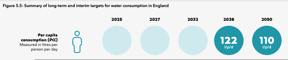 “In England, the regulations require that the average water usage be no more than 125 litres per person per day unless the planning permission for the home has specified that this needs to be reduced to 110 litres per person per day.”