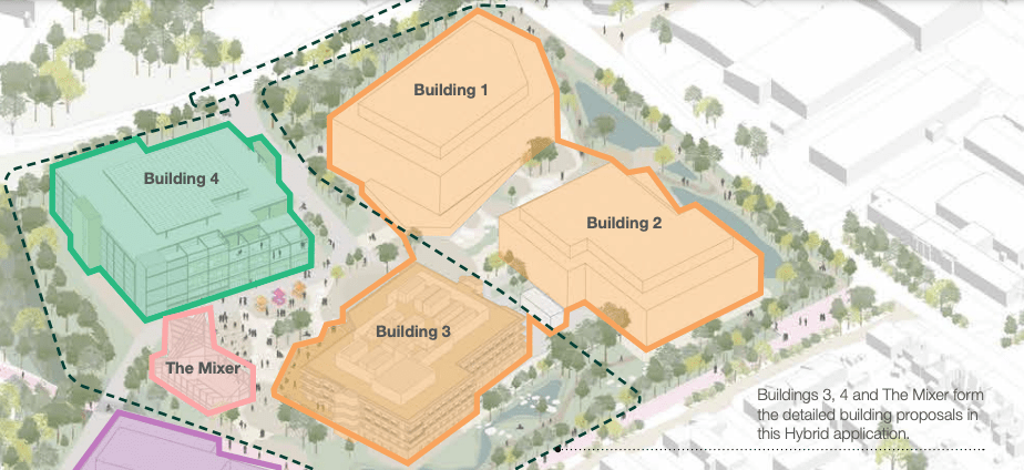 Above – “The Mixer” in the background – the rust-coloured building. From the second Design and Access file (03 – 04) here