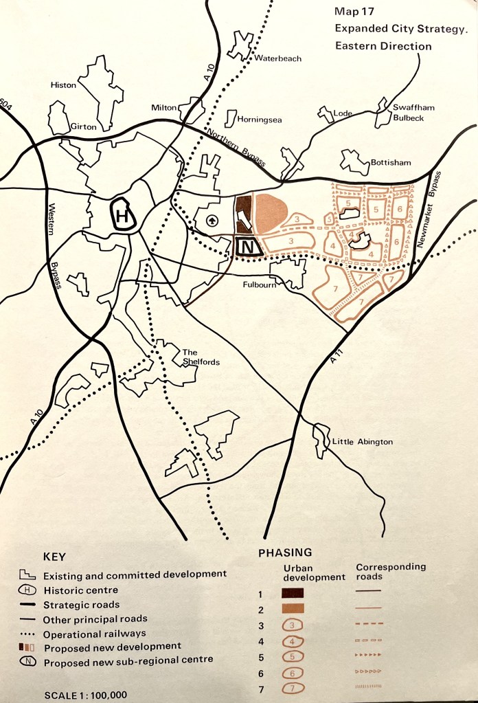 We had a look at John Parry Lewis’s report on the Cambridge Sub-Region from around 50 years ago (have a browse here) – the maps below giving a real sense of scale given that his proposals had the target of increasing Cambridge’s population to 200,000 by the Millennium.