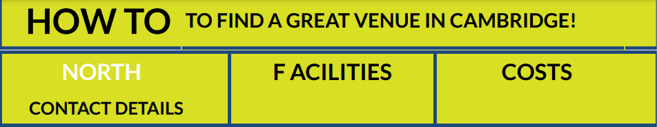 For those of you who want to start small, the cheapest venues to book aside from any free rooms that cafes may have, are in local branch libraries (See Cambridgeshire Libraries rooms here) where you can book a room for as little as £14 for a couple of hours.
