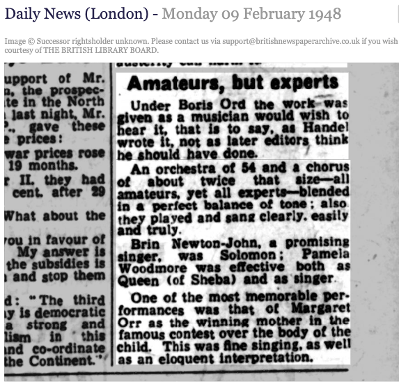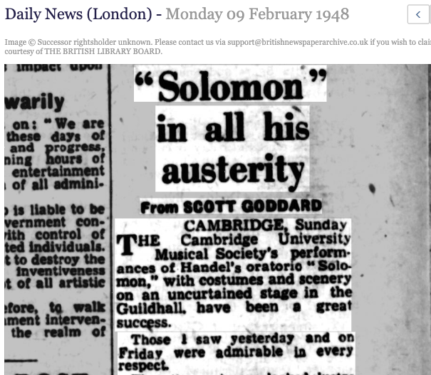 Having been at the talk by Prof Mary Joannou on Cllr Clara Rackham at the Museum of Cambridge earlier, I was reminded of Clara’s influence on the old Cambridgeshire County Council’s education committee – the committee that selected and approved the appointment of Olivia’s father, Brinley Newton-John as the Headmaster of the County High School for Boys – today’s Hills Road Sixth Form College. Given the number of concerts the latter sang in (he was a prominent baritone/bass vocalist in and around Cambridge) across city and district. If you want an example of breaking town-gown barriers, both Clara Rackham and Brinley Newton-John provided numerous examples of how to do this. Cambridge University’s Musical Society performing Handel’s Solomon on a shoestring budget due to continued post-war austerity, at Cambridge’s Guildhall (the large hall of 1862) with an orchestra of over 50 musicians and a chorus of over 100.