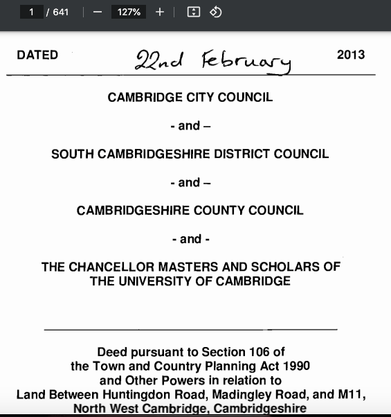 The contract concerned is known as a “Section 106 agreement” – i.e. made under Section 106 of the Town and Country Planning Act 1990. Because of the scale of the NW Cambridge (i.e. Eddington) site, the S106 agreement ***is a monster of a document***. It runs into 641 pages, and this is from a planning application that has 647 documents of multiple page lengths. Iron filings in haystacks anyone?