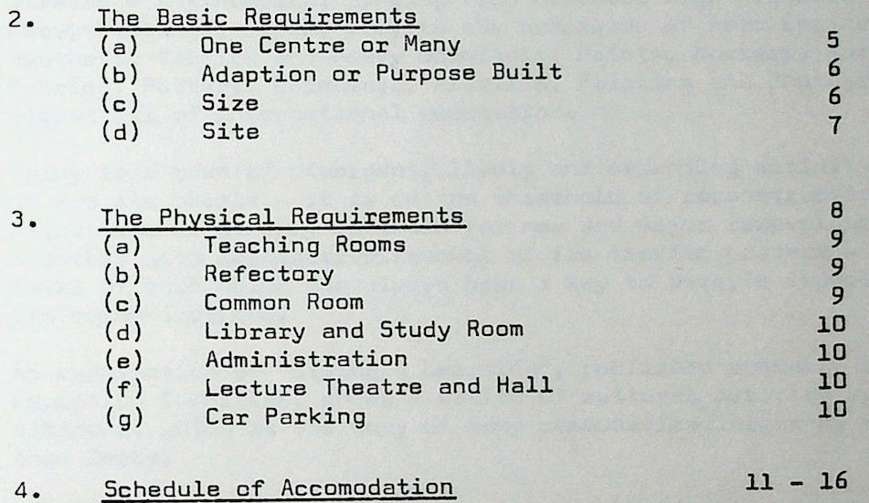 Above – from the contents – note the basic requirements look at location, and the physical requirements look at the needs of service users (people!) and the demands of the courses that are to be taught there.