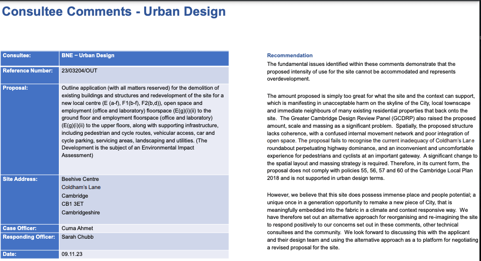 You can read the Urban Design Report that summarises the comments from, & significant issues raised by the Greater Cambridge Design Review Panel of 24 Nov 2023 via the planning portal, typing in Ref 23/03204/OUT into the box in the simple search drop-down, and click on the Urban Design Document 24 Nov 2023
