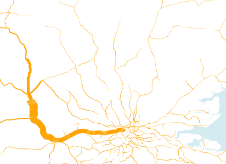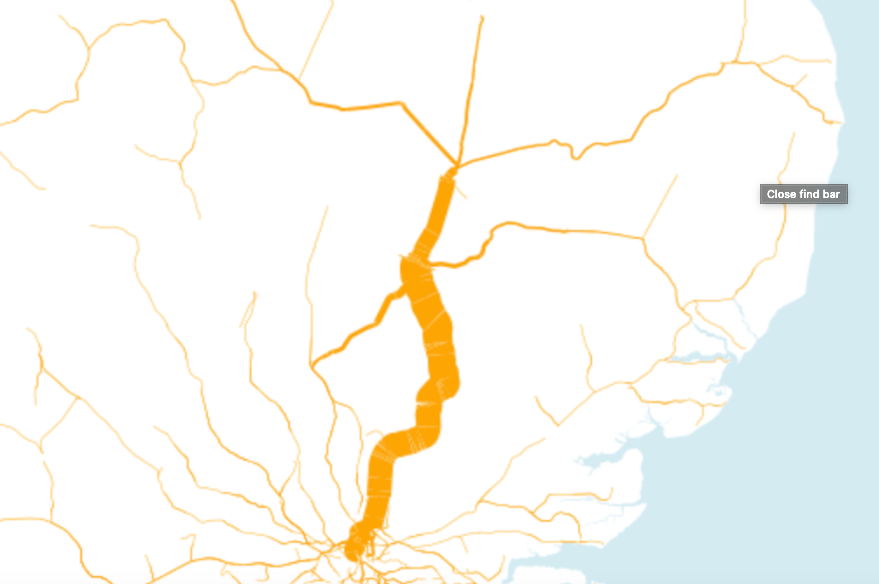 London – and you can see the quirk in the system that assumes everyone goes down the Liverpool Street line when (in my experience at least with commuting) most people go via King’s Cross – which means heading up towards Stevenage, then swinging around to the right at Hitchin and onto Cambridge.